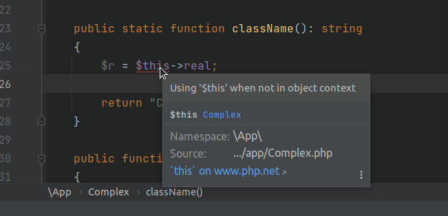 Attenzione! Nei metodi statici di PHP, non essendo nel loro contesto definito alcun oggetto, non si può fare riferimento alla variabile $this. Se ci si prova già l’IDE Intellij IDEA segnala il problema: